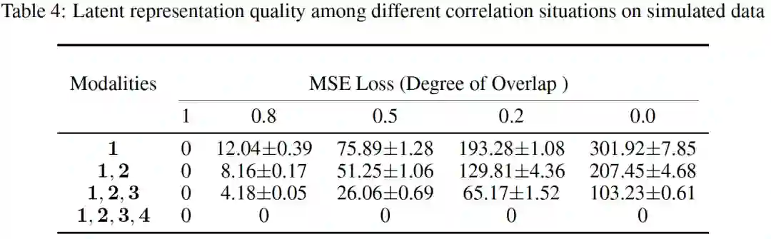 由于真实数据集很难定量的控制模态相关性程度。为了研究这个问题,论文使用机器自动生成的方式,构造了不同的模态关联数据用于验证。这里考虑三种情况:(1)模态之间完全不共享信息,即每个模态只包含模态特定的信息。(2)所有模态之间共享所有信息,没有区分。(3)介于两者之间,既共享一部分信息,也保有模态特定信息。