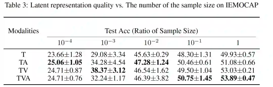 数学公式里是按照经验损失来计算的,是负数。这里用分类准确率来衡量,是正值。数值越大,代表潜表示的质量越高。如下表所示,使用越多的模态,