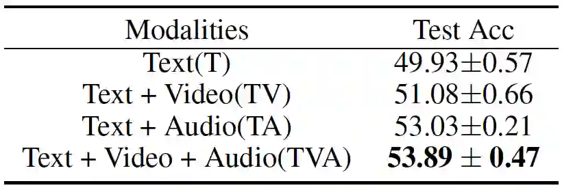 实验一:多模态学习效果更好。这一部分实验非常直接,见下表,使用全部模态取得了最好的效果。