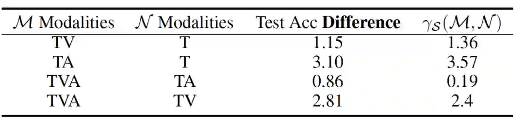 这表明了两部分信息:(1)随着数据量 的增大,模型的内在复杂度的影响会被降低。(2)随着数据量 的增大,上式容易被满足,即使用更多的模态的学习效果优于更少模态的效果。