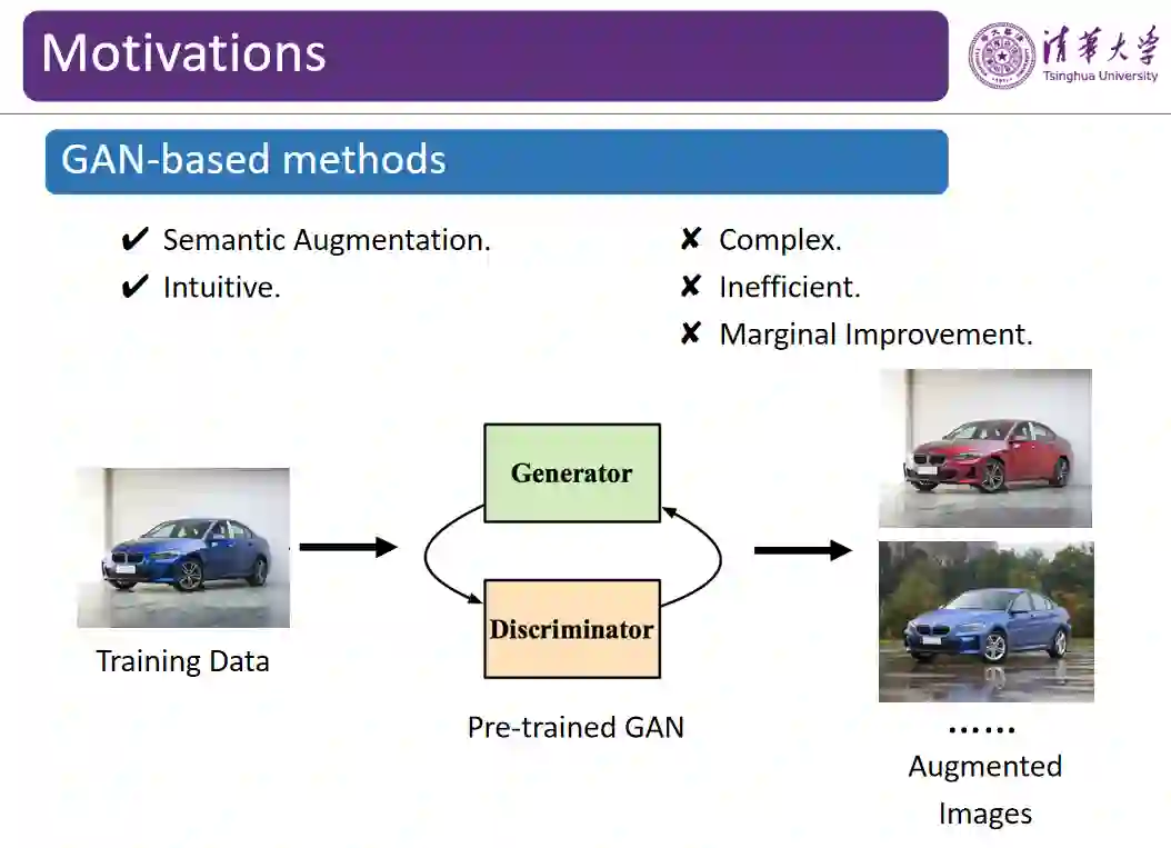 目前,研究人员已经提出了一些进行语义数据增强的方法。例如,利用所有汽车的图像构建一个数据集,从而形成一个数据分布,其中每一类包含数十到数百张图像。我们可以使用该数据集训练一个对抗生成网络(GAN),并利用训练好的 GAN 生成无穷无尽的汽车图像。然而,基于 GAN 的方法存在诸多弊端:首先,GAN 的训练十分困难。该方法将引入大量额外的计算量,其优化过程也十分不稳定。其次,此类方法对模型性能的提升较为有限。通常,数据集中每个类别的图像大致有数十到数百张,而我们只能针对每一个类别训练一个 GAN。尽管我们也可以使用 Conditional GAN(CGAN)类的方法,但是 GAN 生成的图像质量仍然较差。如果我们使用这样生成的数据训练下游的分类器,只能得到微弱的模型性能提升。