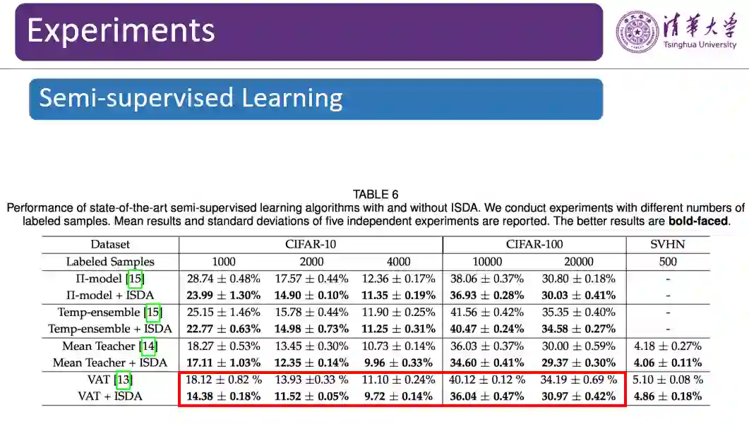 ISDA 在半监督学习任务上的性能提升更为明显。这是因为,半监督学习设定下训练数据相对比较少,通过数据扩增把可以有效增加训练数据量,提升泛化性能。
