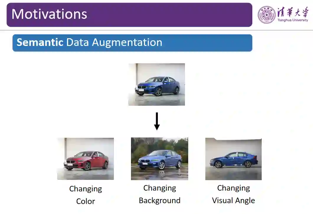 为了进一步提升数据扩增的效果,我们试图进行更加高级的变换。例如,我们把可以更换汽车的颜色、切换一个观测视角、或者换一个车标,此时它仍然是一辆汽车。然而,相较于前文提到的旋转、翻转、裁剪等简单变换,这类相对「高级」的变换要困难得多,我们将其称为「语义数据增强」。在这里,我们将重点讨论如何实现更好的语义数据增强。