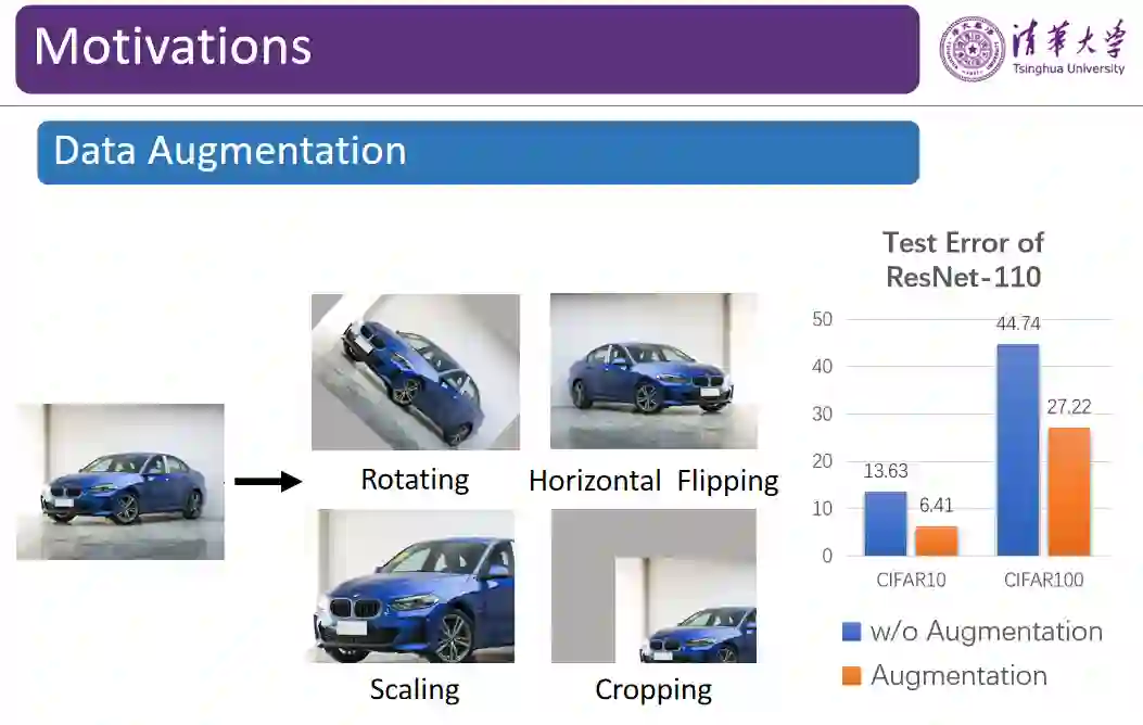 在标注数据不足的情况下,数据扩增是一种非常有效的提升模型性能的方法。如图 2 所示,在右侧的柱状图中,我们比较了在相同的实验设置(优化器、训练时长等)下在 CIFAR-10/CIFAR-100 数据集上进行数据扩增前后的测试误差,其中蓝色代表未使用数据扩增的实验结果,橙色代表使用数据扩增的实验结果。在 CIFAR-10 数据集上,测试误差从 13.6% 降至 6.4%;在 CIFAR-100 数据集上,测试误差从 44% 降至 27%,模型的性能提升十分显著。相对于深度学习模型和其它方面的优化,数据扩增的有效性举足轻重。