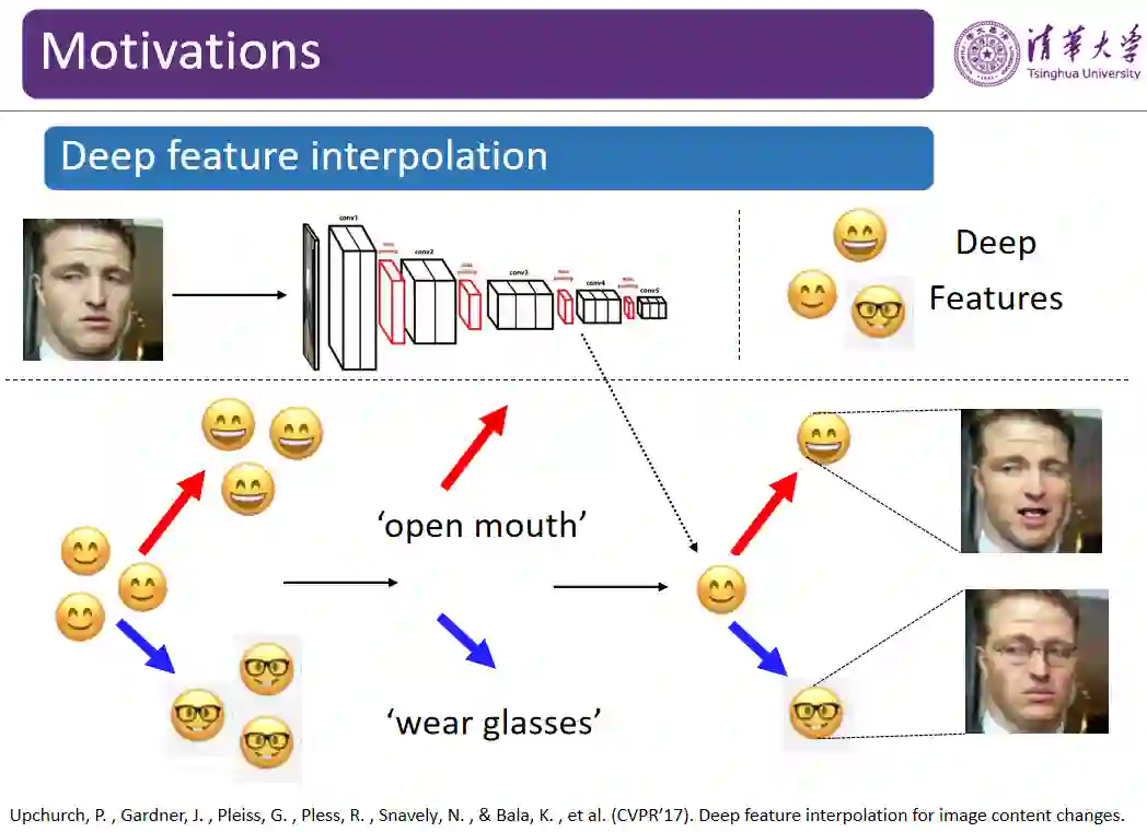 在论文「Deep feature interpolation for image content changes」中,作者需要手动地在特征空间找出进行「深度特征插值」的方向。举例而言,作者可能会手动收集一些戴眼镜的人脸与不戴眼镜的人脸,找出这两类人脸变化的方向,将该方向上的向量应用到不同的样本上,为不戴眼镜的人脸戴上眼镜。然而,这一过程的工作量巨大,通过人类手动的方式也只能找到非常有限的方向。实际上,人脸、汽车等图像数据可能涉及各种各样的变换,通过手工的方式很难实现多样化的数据扩增。如何实现高效、多样化的数据扩增成为了一个挑战。