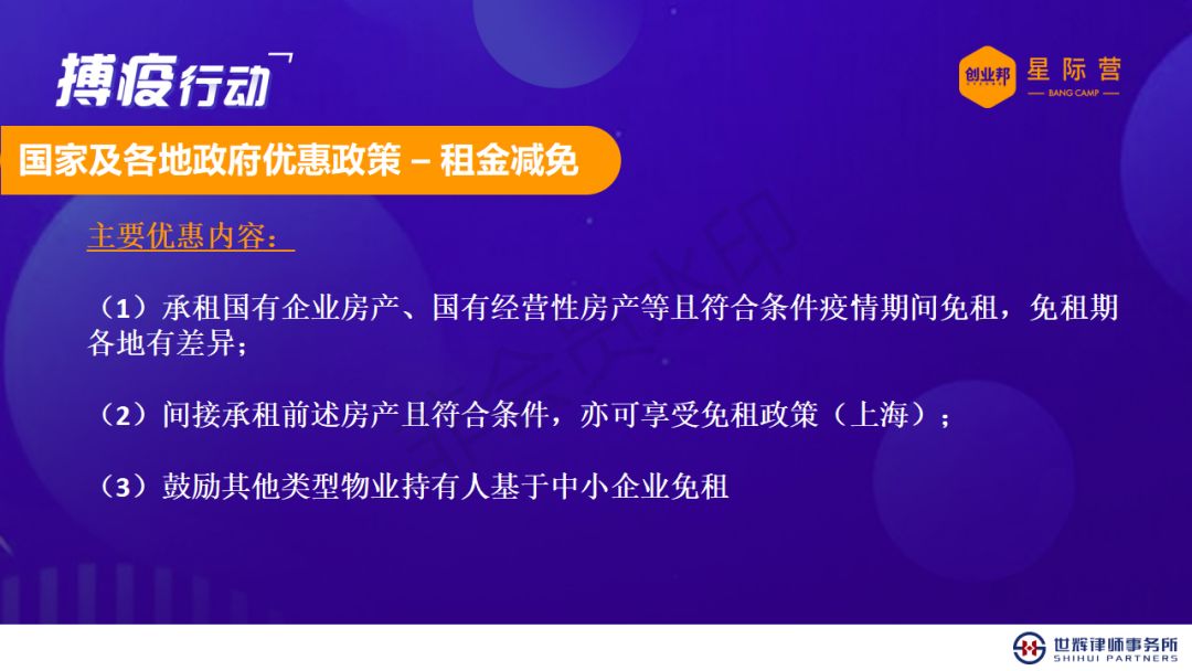 第二块是租金减免的政策,国家包括一些地区出台了一些政策,就是说如果你租赁的是国有企业的房产,或者是国有性质的经营性的房产,这些国有企业会给予我们民营中小企业一定的免租期,但是这个政策各地是不一样的,待会我会介绍一下各地的一个政策,所以租金减免其实不涉及承租的是民营企业所持有的这些物业,可能我们很多的中小企业承租的房产并非是这些国有企业所持的物业,这些要怎么办?我待会也会介绍到我们要怎么处理。