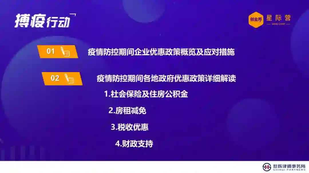 2月23日晚,创业邦星际会“搏疫行动”系列直播课第九讲。我们邀请了世辉律师事务所合伙人朱赞给大家带来视频直播分享:《疫情之下,企业优惠政策解读及应对策略》,同时特邀创业邦星际营导师名川资本创始合伙人王求乐作为陪伴导师身份来给本次直播助阵。