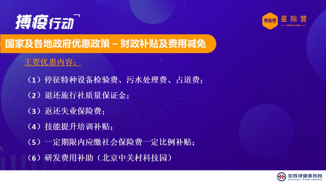 第四块还有一些财政支持类的政策,比如说像北京中关村科技园,如果您在中关村科技园内的企业可以去申请研发费用的补贴,有的各地其实都出台了,比如说像你企业如果在疫情防控期间,你给员工去提供比如说在线的能力、职业能力、技能提升方面的培训,或者你邀请第三方的培训机构给员工进行培训,是可以去申请培训的补贴,然后包括有的地区还减免了一些费用,比如说像占道费等等一系列费用,主要我们中小企业可以享受到的优惠是这几个层面。