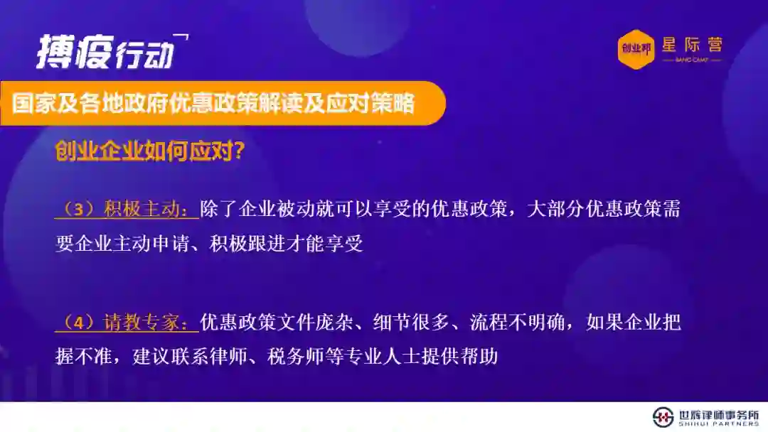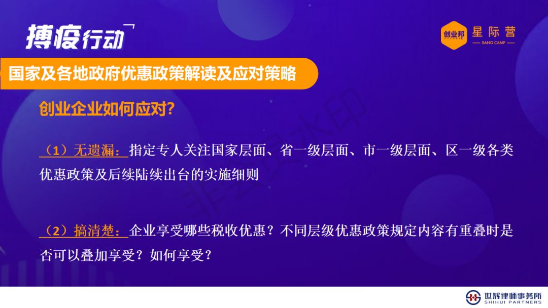 刚刚提到非常多层级的政府部门都在出台这些政策,内容非常的庞杂,我们创业企业要如何来应对这些?这些政策我们梳理了一下,我们建议第一无遗漏,我们希望创业企业可以指定一个员工来专门来关注我们疫情防控期间,国家层面、省一级、市一级,包括区一级政府出台的这些政策,这样避免遗漏,因为一旦你遗漏一个政策,可能政策里面正好出台了一项优惠,刚好是我们企业是可以享受这样优惠,如果我们错过了可能就错过了,因为待会我会介绍到很多的优惠政策,其实并不是我们企业被动享受就可以享受的,而是需要我们主动要去积极申请了之后才能享受的。