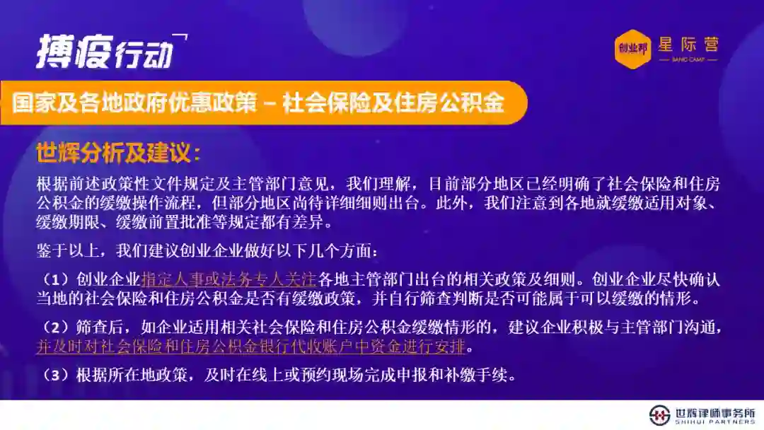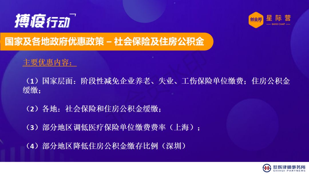 这一块社保公积金分享的是北京地区的,其他地区其实跟北京地区是大同小异的,如果大家想要了解其他地区的详细的政策,可以联系创业邦的同事,我们有梳理一个非常详细版本的PPT,里面会有详细的内容。然后就社保公积金这一块,所以刚刚也有提到我们建议在等待一些地区的细则出台的同时,建议企业首先指定一个专人去关注这方面的优惠政策,有没有缓缴,我们企业是不是适用?