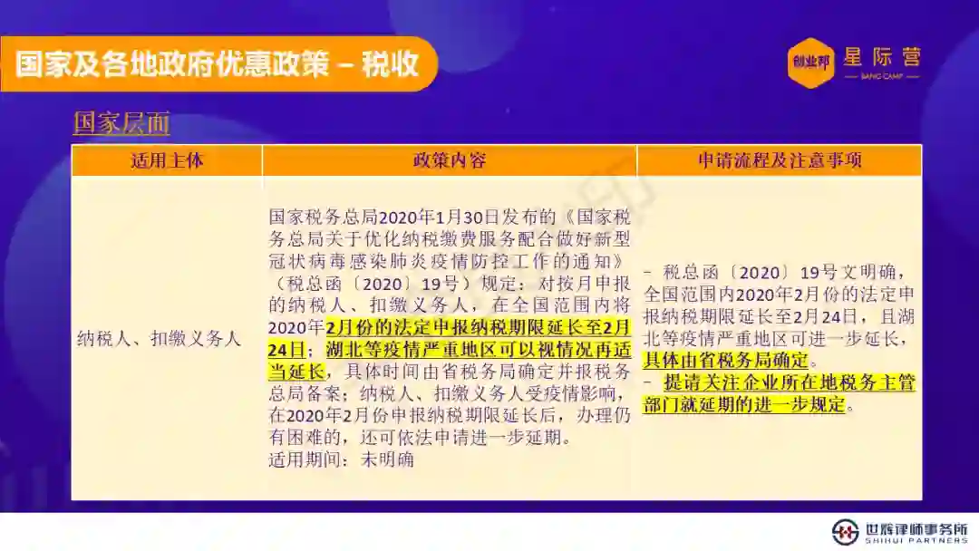 第二块是地方层面税收的优惠政策,地方层面主要的内容是提到符合条件的这些企业可以申请延期缴纳税款,延期的时限,各个地方略有差异。第二还有部分地区有明确规定,符合条件的这些创业企业可以减免部分的税,比如说像房产税,比如说像城镇土地增值税等等,这是地方层面的主要的内容。我们可以看一下国家层面的主要的优惠内容。国家层面主要的优惠内容刚刚有提到,首先第1个申报的纳税期限,2月份的法定申报纳税期限,可以延长到2月24号。