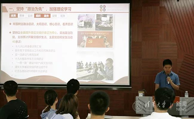 地研14党支部书记武超和无研175党支部书记王仲潇分别介绍了教育部双创样板党支部和清华大学标兵党支部的创建情况。地研14党支部以党建为龙头、以生态文明建设为特色,号召同学们为绿水青山扛起时代责任,以青年之力书写伟大中国梦。无研175党支部以“汇聚红色电波,奉献集体能量”为主题,将专业特长和时代发展相结合,最大化辐射集体的能量。