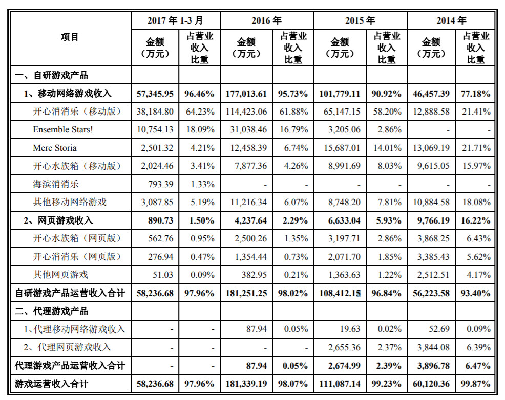 从游戏对主营业务的贡献来看,报告期内,发行人的营业收入主要来自游戏《开心消消乐》(移动版)、《Ensemble Stars!》、《Merc Storia》及《开心水族箱》(移动版)。乐元素旗下有5款以上的游戏,开心消消乐是最大的营收来源,随着它的爆红,这款游戏原来只占公司营收的两成,到2015年之后就暴涨到占比六成。