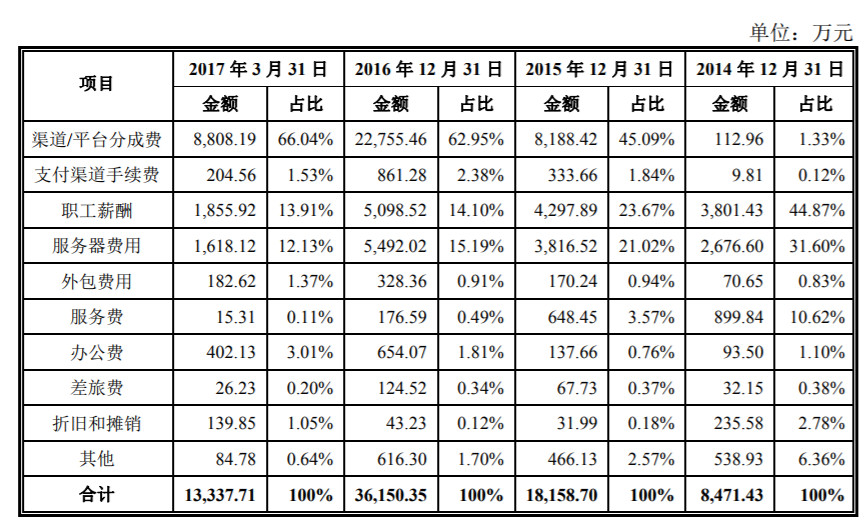 乐元素大部分采用的则是联合运营模式,公司不仅自研游戏产品,还承担自研游戏产品的游戏运营业务,带来运营利益同时,也需公司承担相应的运营成本费用,从而影响了公司的毛利率。按照合作运营协议,公司在收到玩家充值金额后,需要将属于游戏渠道/平台的分成金额支付给游戏渠道/平台,根据主营业务成本,这部分费用占到主营业务成本的六成。(一年光是支付给支付渠道都有八百万……)