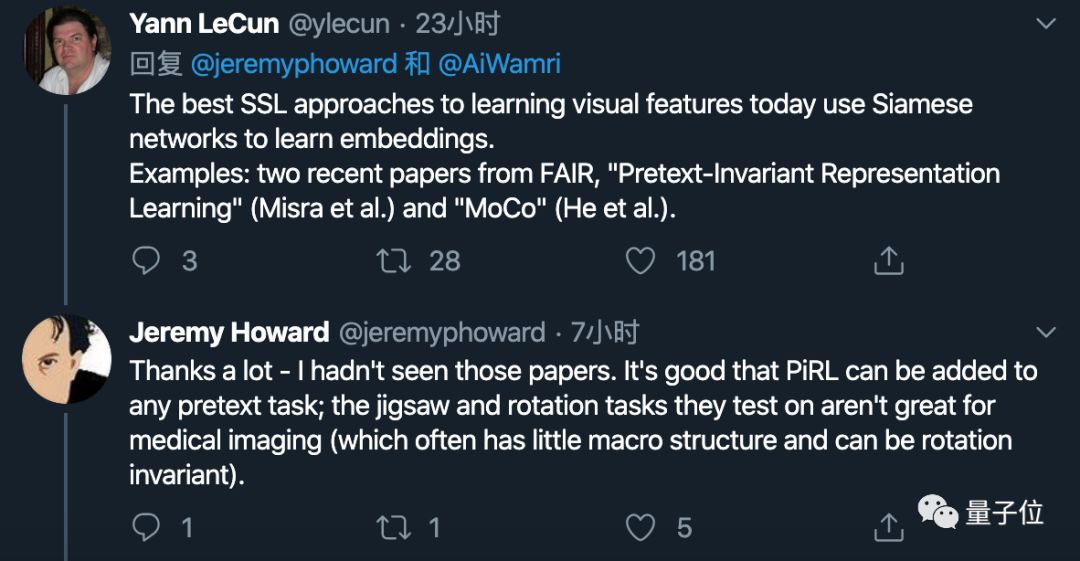Jeremy Howard在发出这条Twitter之后,深度学习三巨头之一的Yann LeCun对其回复。