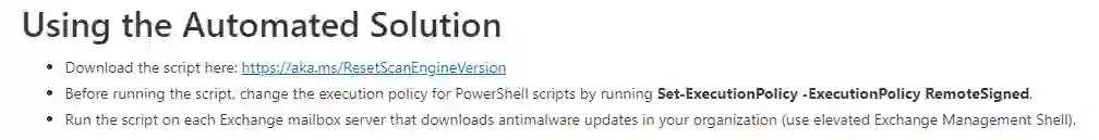 代替使用脚本,客户也可以手动执行步骤来解决问题并恢复服务。要手动解决这个问题,用户必须在组织中每个下载反恶意软件更新的Exchange邮箱服务器上执行以下步骤。