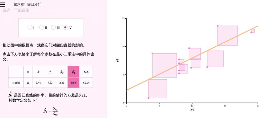 第二步:拖动右侧方形滑块的点。你会看到你随意点击拉动的方块大小,最终影响到这条直线的斜率,即线性回归的相关系数不断变化,包括SSE(残差平方和)的变化。如图所示,你不理解一些特定的字母意义,也可以点击查看介绍。我们通过互动理解了这个方程的每一部分。