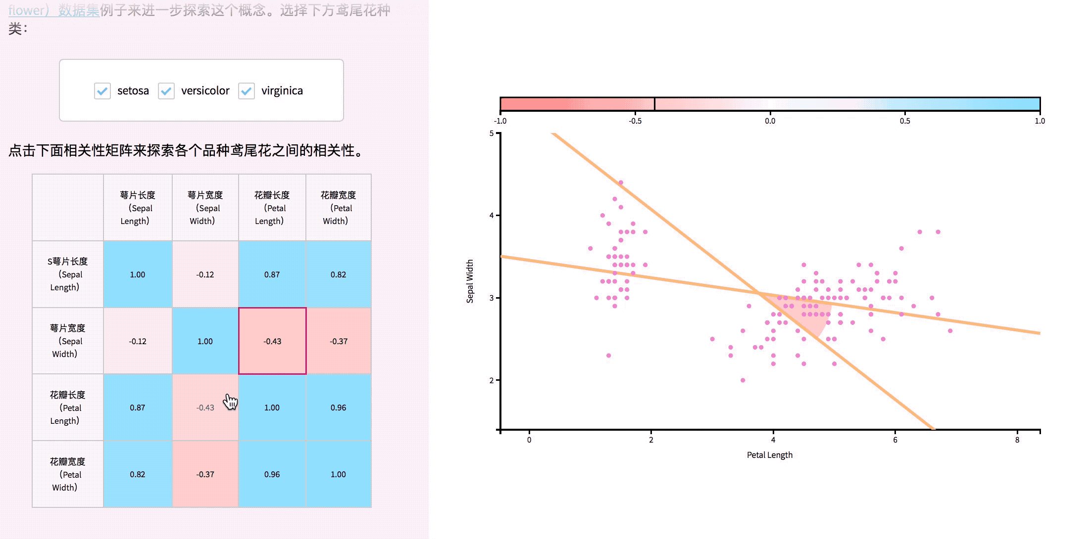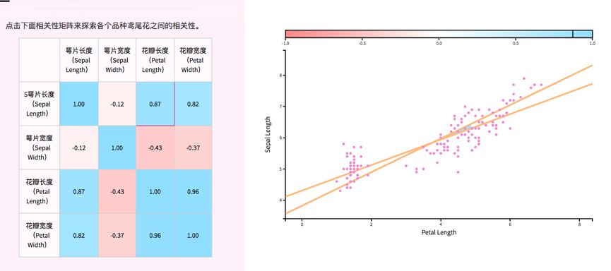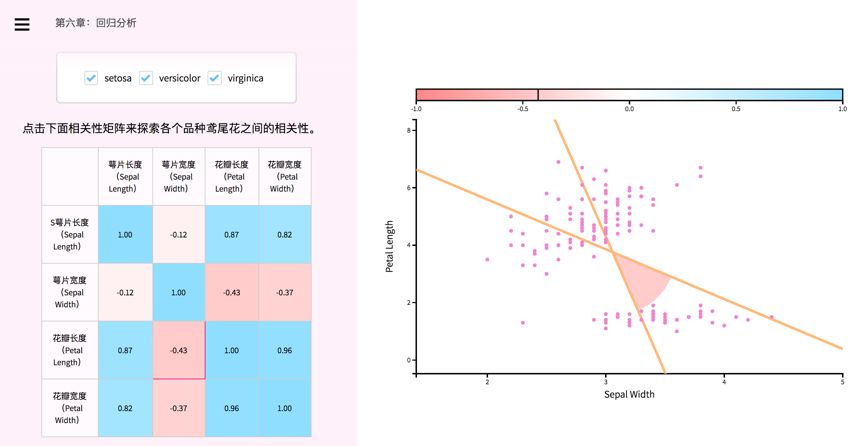 接着下一节【相关性】,用的是Edgar Anderson的著名的 鸢尾花(Iris flower)数据集来显示数据的视觉特征。诸位曾经学习datamining, analytics, stat, biostat的同学,就会懂得这朵花。