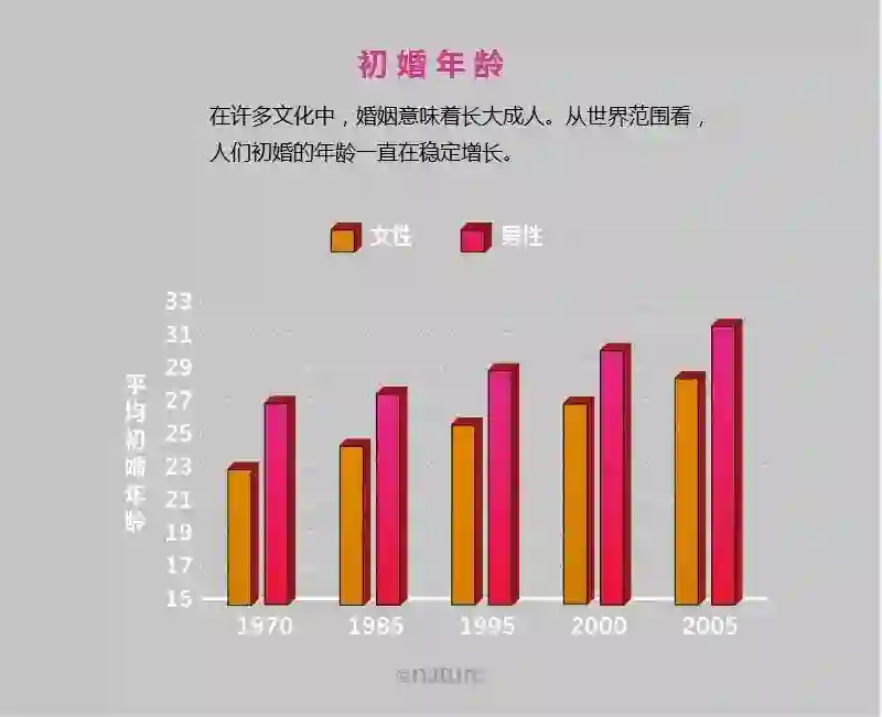 但是在目前的许多国家,成年的传统标志正在变得越来越晚。年轻人在学校里待的时间变长了,和父母住在一起的时间也变长了,结婚生子的年龄也变大了。美国亚利桑那大学的人类学家 Alice Schlegel 指出,在许多文化中,婚姻一直被当成成人的一个标志。根据联合国的数据,在过去的 20 年里,全球女性初婚的平均年龄提高了 2 岁。在一些国家,这个变化更为惊人:在巴西,女性初婚的年龄增加了 6 岁,变成了 27 岁;在欧洲的一些国家,女性初婚的年龄上升到了 30 岁(见“初婚年龄”)。