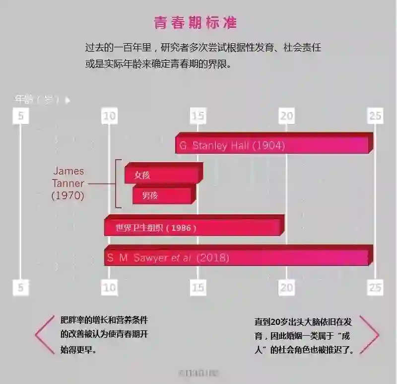 但是现在罕有研究者对此如此肯定。青春期是两段过渡期之间的时期,它是儿童期的结束和成年期的开始,它的边界是可变的。流行病学数据显示,在一些国家性发育时间提早,其中包括美国和中国;而就青春期的末尾而言,随着社会变化以及人们对大脑发育时间线认识的增长,成年期的公认起点被推迟到了 20 多岁。