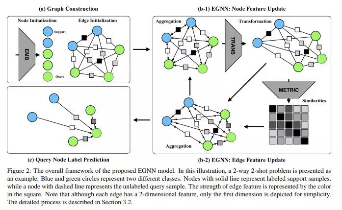 图神经网络已经被用于小样本学习领域。其基本思想是,每个图像都可以作为图中的一个节点来表示,而且信息(节点表征)可以根据它们之间的相似度在它们之间传播。通常而言,分类任务是根据节点表征之间的距离隐式地完成的。在这里,作者建议在每条边上加上显式的特征来描述节点之间的相似度。