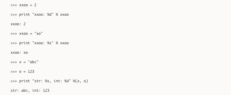 说明:双引号里面%操作符算是占位符吧,d代表数字,s代表字符串。双引号外面%加上后面的变量名对应里面的第一个%。
