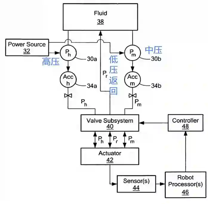在此基础上,波士顿动力在2011年5月18日提交的专利申请US20120291873A1中公开了一种具有高压油路,中压油路和低压返回油路的液压系统,如下图所示。