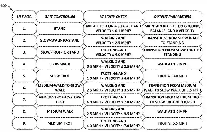 波士顿动力为实现各种步态的顺利转换,制定了步态列表并可查询,其在2015年11月3日申请且已授权的专利US9789607B1、以及在2016年06月27日申请且已授权的专利US10017218B1中,均公开了基于转向命令使足式机器人实现目标步态。