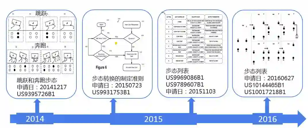通过检索,波士顿动力在步态转换方面先后申请了6件专利,其技术发展如上图所示,主要涉及如何实现不同步态、制定步态转换准则、制定步态列表等。
