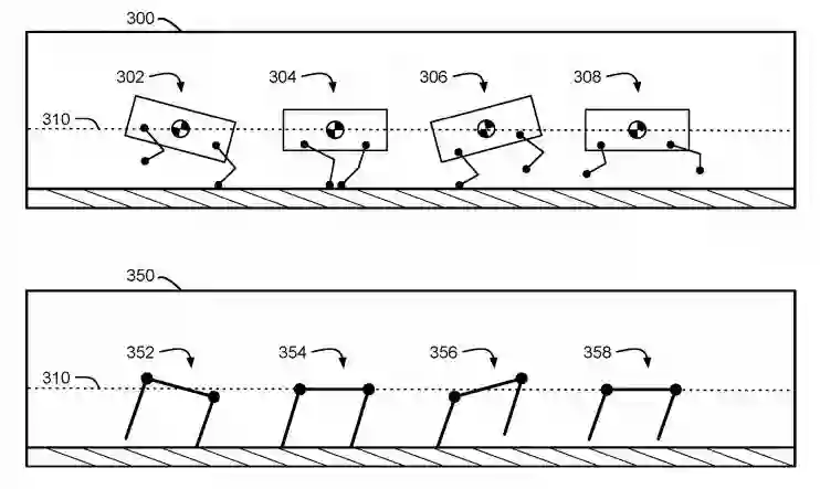 基于此,波士顿动力在2016年6月27日申请且已授权的专利US10059392B1中公开了一种控制具有非恒定俯仰角和高度的机器人装置,通过调整机器人前后部分的质心位置可以使保证机器人在奔跑中保持机身重心高度一致,如下图。