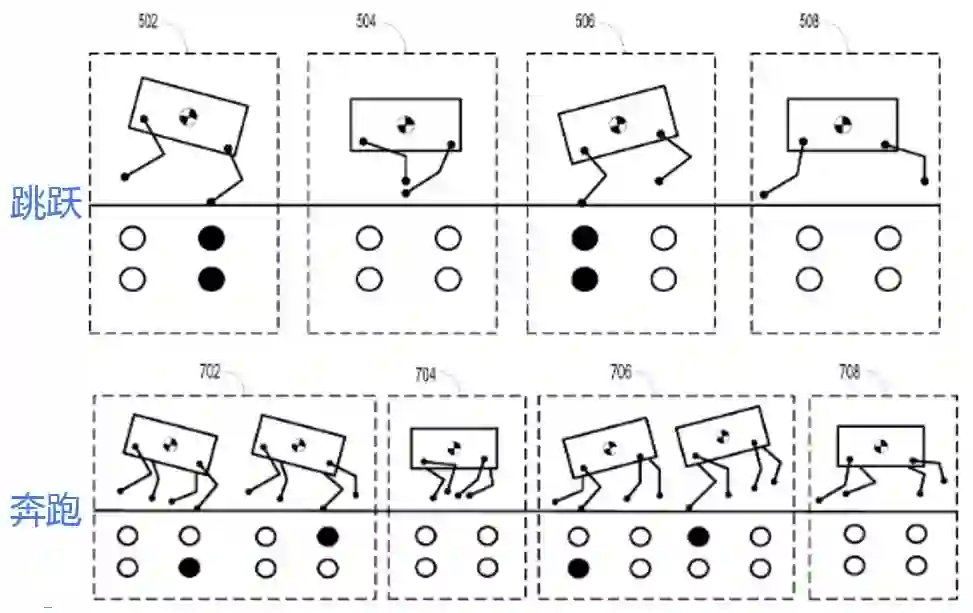 波士顿动力在2014年12月17日申请且已授权的专利US9395726B1中公开了机器人通过控制俯仰角、高度、速度以及其产生的力实现不同的步态,下图所示,Bound步态用于完成一般奔跑,而Gallop步态适合于高速奔跑。