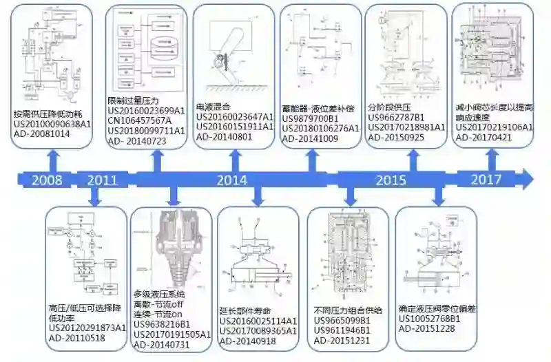 动力问题是机器人的核心问题,关系着机器人能否动起来,工作时间的长短。波士顿动力早期的机器人主要是电机通过齿轮驱动连杆机构,对于没有载荷要求的机器人而言是足够的,对如Bigdog这类以内燃机为动力且需搭载较大负荷的机器人则显得力不从心,为此,波士顿动力在液压驱动方面布局了较多专利,如下图的液压控制技术发展路线。