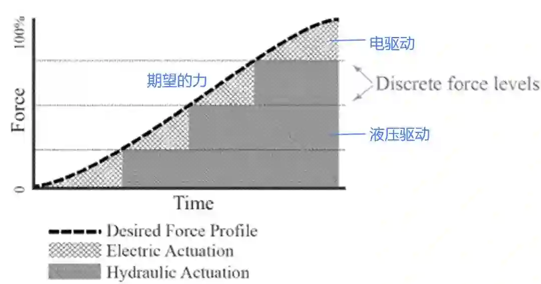下图是机器人的期望驱动力,期望的力为液压驱动力和电驱动力的总和,液压驱动为离散力,电驱动为连续的力,两种驱动方式相互补充从而形成期望的力,达到最佳的驱动效率。