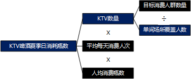 单间KTV日消耗瓶数=3*5%*1=0.15瓶/天,每天家中3人,5%的人会消费且平均1瓶。
