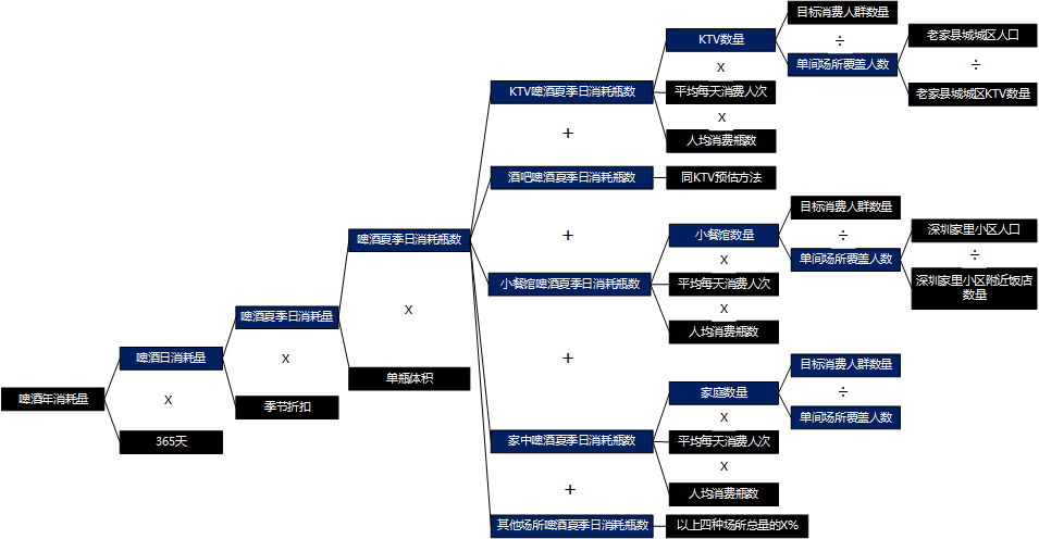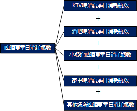 现在来拆解啤酒夏季日消耗量,我能想到的主要消费场所是:KTV、酒吧、小餐馆和个人家中。这些场所也是互相独立的,为了不漏,必须加上个“其他场所”。