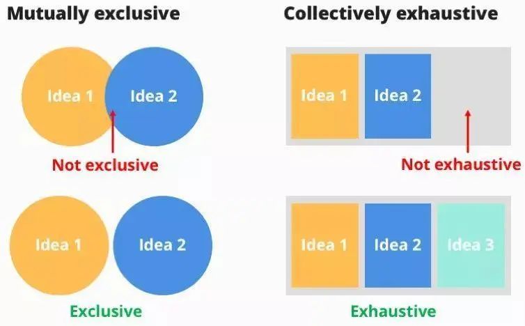 各部分之间相互独立 (Mutually Exclusive) ——“相互独立”意味着问题的细分是在同一维度上并有明确区分、不可重迭的;