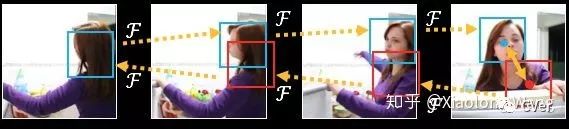 如下图所示,假设我们用这个network进行tracking。在最后一帧上,我们首先随机选一个起bounding box,然后对这个bounding box进行backward tracking(蓝色箭头),接着对在第一帧的结果进行forward tracking(红色箭头)。那么initial box和最后的tracking box之间的error(黄色箭头)就会作为我们训练network的supervisory signal。我们把这个signal称为Cycle-Consistency Loss。