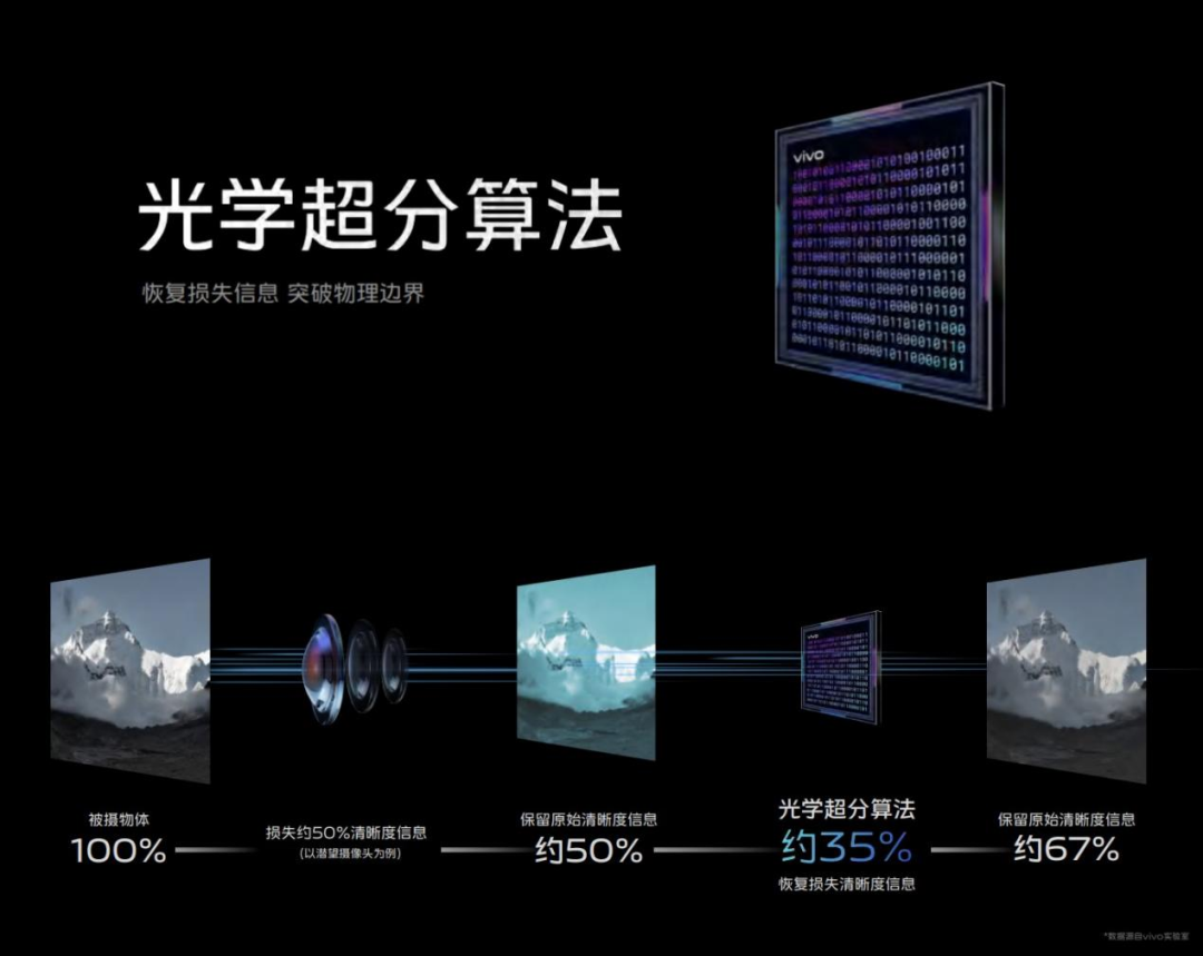 可以发现,足够清晰的画面是大众用户群体衡量一张照片或视频是否足够好的重要基准,受限于手机相对局限的体积限制,长焦的成像画质一直成为了目前各大手机厂商有待攻克的难题,而 vivo 在本次发布会中带来了一项名为“光学超分算法”技术,并构建了全新的系统性的AI画质解决方案——超清画质引擎,通过 X90 系列长焦镜头阵容,据说可以带来 5X 以上焦段解析力提升 64% 的出众能力。