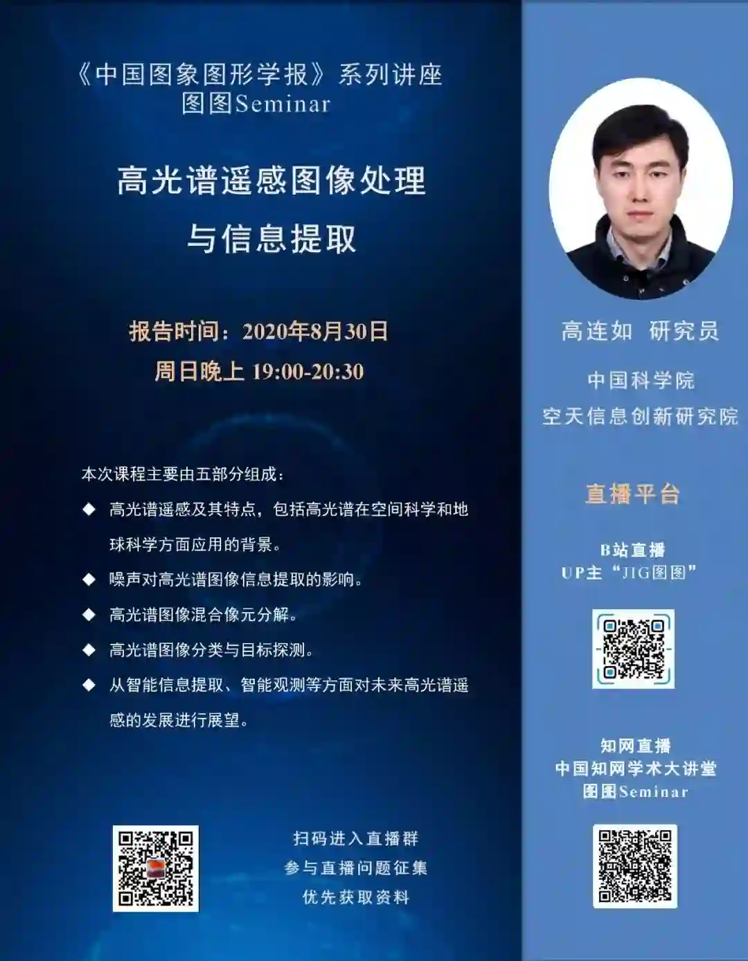 本期“图图Seminar”特别邀请中国科学院空天信息创新研究院——高连如研究员,为大家带来“高光谱遥感图像处理与信息提取”的直播报告,并由北京理工大学李伟教授进行主持及现场互动。机会难得,从事高光谱相关研究的的图粉们不要错过哦
