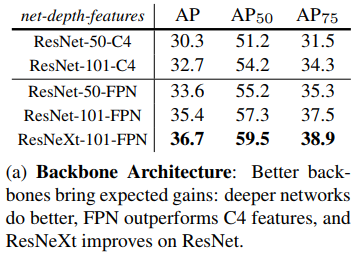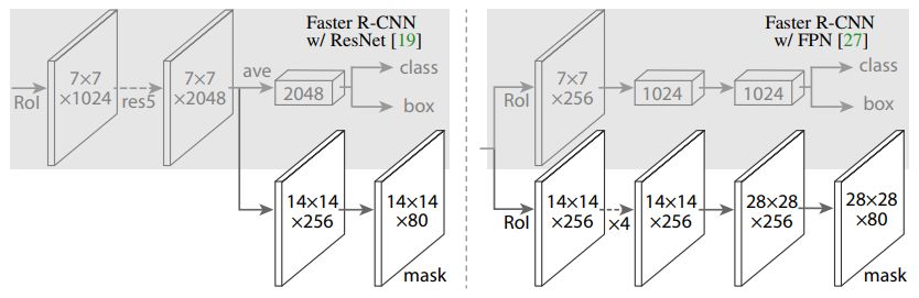 作者将网络分成三部分,第一个是主干网络用来进行特征提取,第二个是头部网络用来分类和边界框回归,第三个就是 mask 预测,如图7,左图使用残差网络提取特征,右图使用特征金字塔网络提取特征。