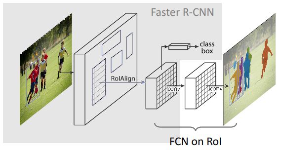 Mask R-CNN = Faster R-CNN with FCN on RoIs,其网络结构如图4所示。灰色部分为 Faster R-CNN 的的网络结构,作者将 Faster R-CNN 中的 RoI Pooling 层替换为提出的 RoIAlign 层。同时, 在目标框识别分支处,添加 Mask 预测分支,使用 FCN 预测 RoI 当中像素所属分类。
