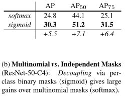 Mask R-CNN 输出中,每个 class 都有一个预测的 mask(Class-Specific)。如果不考虑类别,无论什么类,只输出一个 mask(Class-Agnostic),对结果有什么影响。实验发现: