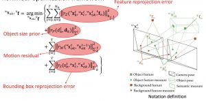 港科大沈邵劼老师团队的最新文章,他们的 VINS 在 VIO 领域具有很不错的开创性成果。现在他们切入自动驾驶领域做了这篇双目语义3D物体跟踪的工作,效果还是很不错的。在沈老师看来,SLAM 是一个多传感器融合的框架,RGB、激光、语义、IMU、码盘等等都是不同的观测,所以只要是解决关于定位的问题,SLAM 的框架都是一样适用的。在这篇文章中,他们将不同物体看成不同的 Map,一边重建一边跟踪。使用的跟踪方法仍然是传统的 Local Feature,而 VIO 作为世界坐标系的运动估计。语义融合方面,他们构造了4个优化项: