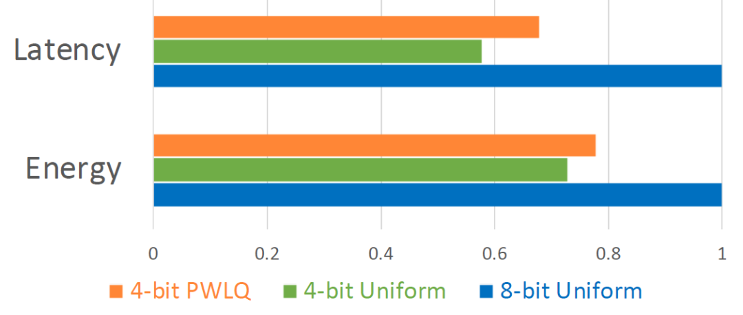 最后让笔者感到欣喜的是文中不仅仅有展示 PWLQ 取得更好精度的优势所在,同时也有真诚讨论 PWLQ 的不足之处。比如,PWLQ 的具体硬件实现中会带来一定的额外消耗,下图是作者给出的关于硬件 Latency 和 Energy 的具体模拟参数来说明这些额外消耗是可以接受的。