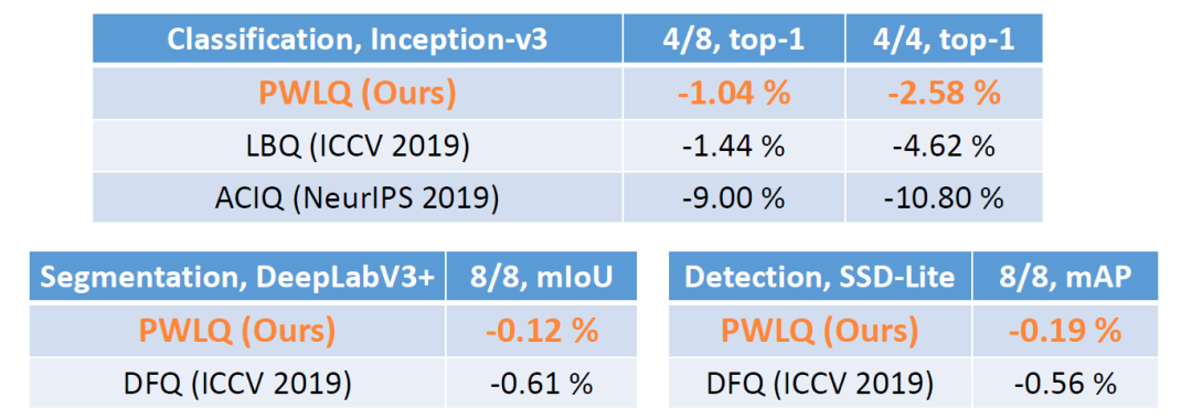 同时文中也做出了 PWLQ 和其他 state-of-the-art 的方法对比。如下图所示,在 4/8 的情况下,PWLQ 比 LBQ(ICCV 2019)和 ACIQ(NeurIPS 2019)分别取得 0.40% 和 7.96% 的更高精度;在 4/4 的情况下,PWLQ 获得更高精度的优势更加显著。与此同时,PWLQ 不仅在 classification 的任务中取得好结果,在 segmentation 和 detection 任务上也得到了相似的好结果。