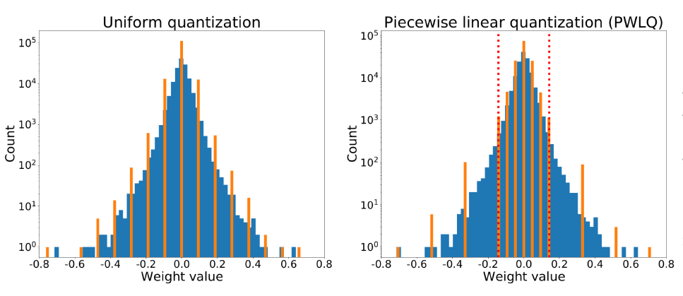 此篇文章就是分析了 4-bit 精度损失的具体原因,并提出了他们的 Piecewise Linear Quantization(PWLQ)的方法来显著的提高量化后模型的精度。如下图所示,训练完的模型的 weights 的分布并不是平均分布,而是近似于高斯分布:绝大多数的 weights 都集中于中心地带,而少数的 weights 分散在稀疏的连边上。可想而知,Uniform Quantization 对于这种分布的近似残差不是最优的。而 PWLQ 把分布区间分为没有重叠的 center 和 tail 两部分,每部分分配相同的量化格点数。这样一来会导致中间部分的近似精度提高,而两边的近似精度下降,但因为绝大部分的 weights 都分布在中间部分,所以整体的近似精度还是会得到提高。