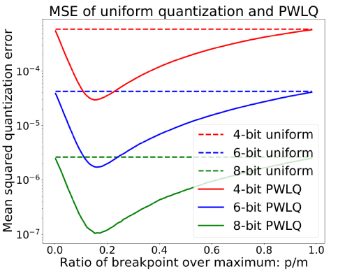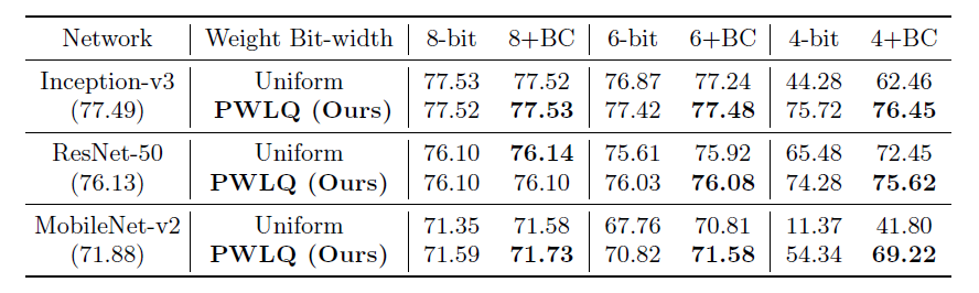 为了加快 Inference,文中提供了找到区分点的 one-shot 的公式。在数值实验中,如下图的三种模型 Inception-v3,ResNet-50 和 MobileNet-v2 在 ImageNet 的结果上,PWLQ 比 Uniform Quantization 有着明显的更高精度。尤其在 4-bit MobileNet-v2 的对比上,PWLQ 有高出 27.42% 的精度,由此可见 PWLQ 有着更强大的 representational power。