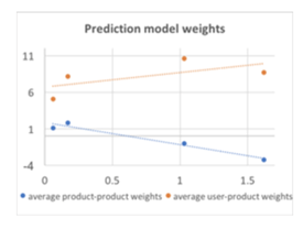 下图是我们对求解模型的一个解释。我们发现高活跃用户更加看中自己的倾向,预测模型的权重在用户偏好类的特征中高(high model weights on user preference features);低活跃用户更加依赖于平台的推荐,更喜欢平台选择的搭配性好的商品,预测模型权重在商品搭配性的特征权重高(high model weights on )。这可以直观的理解为深度用户在选择商品上更有自己主见,而新手更依赖与平台。