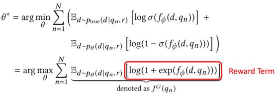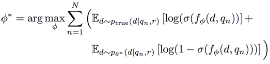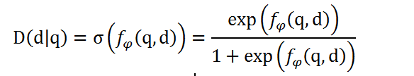 Discriminator:f_φ (q,d),其中,φ是D的参数。D的输入时Query-Document对数据(q,d),而输出则是这对数据是否匹配。这相当于一个二分类问题,可以通过logistic regression给出: