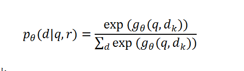 Generator:p_θ (d|q,r),其中,θ是G的参数。G的输入时Query,输出是与Query相关的documents的概率分布,相关性即由这个概率分布表示。p_θ (d|q,r)由Softmax函数给出: